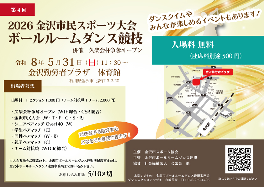この大会は、競技選手だけでなく、初心者から経験者まで幅広く参加できるダンス競技会で、3種目総合の久楽会杯のほか、金沢市民大会単科戦や親子ペア、同性同士、学生限定ペア、チーム対抗戦など、さまざまな部門が用意されており、初めての方でも気軽にチャレンジできる大会となっております。